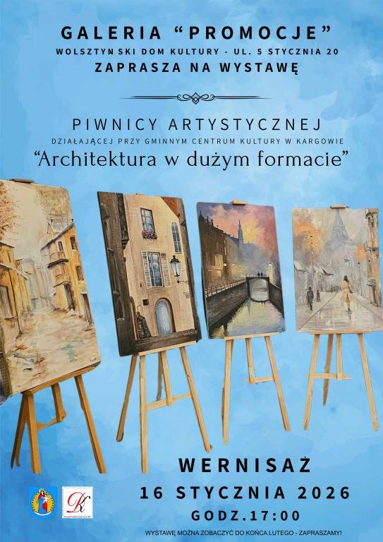 Serdecznie zapraszamy na wernisaż wystawy malarstwa „Architektura w dużym formacie”, który odbędzie się w piątek, 16 stycznia 2026 roku o godz. 17:00 w Galerii Promocje przy Wolsztyńskim Domu Kultury.