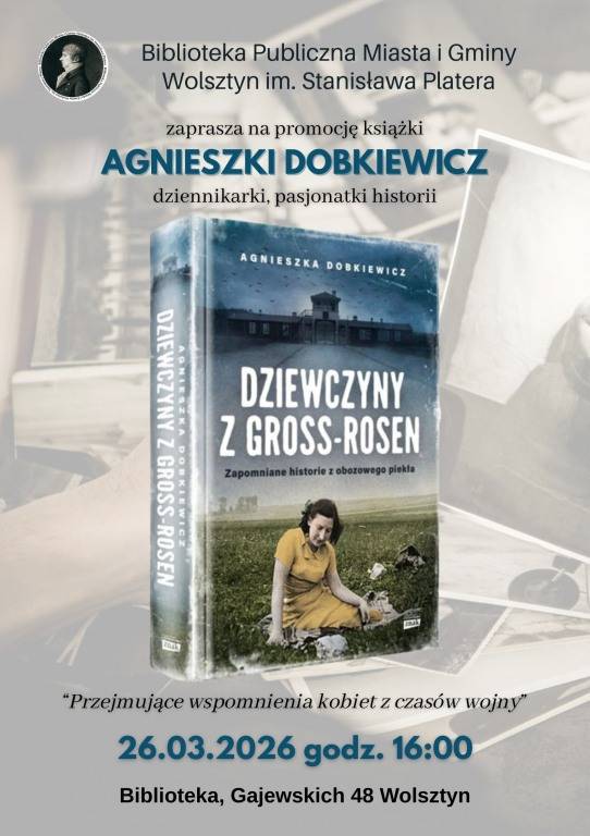Biblioteka Publiczna Miasta i Gminy Wolsztyn im. St. Platera zaprasza na promocję książki Agnieszki Dobkiewicz, dziennikarki i pasjonatki historii pt. "Dziewczyny z Gross-Rosen" 26 marca 2026 r. o godz. 16:00