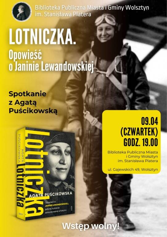 Biblioteka Publiczna Miasta i Gminy Wolsztyn im. St. Platera zaprasza na spotkanie z Agatą Puścikowską - Lotniczka. Opowieść o Janinie Lewandowskiej 9.04.2026 (czwartek) o godz. 19:00. Wstęp wolny!